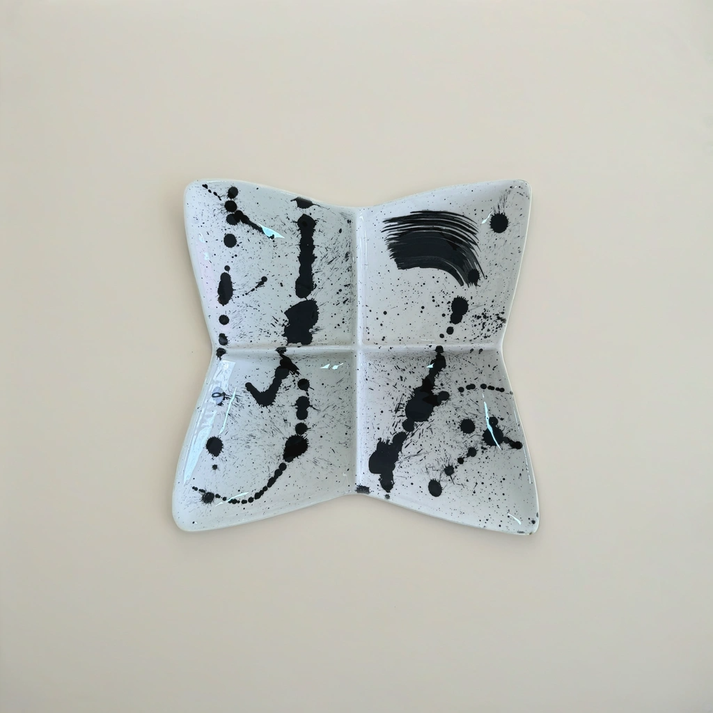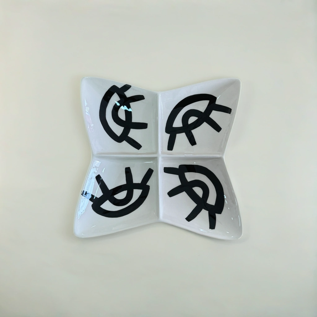 قدَم الطعام بأناقة مع طبق تقديم المكسرات والمخللات العصري بأربعة أقسام! اختر من بين تصميمين مذهلين - عين سوداء مرسومة باليد أو طرطشة بخلفية بيضاء. مثالي لأي إعداد مائدة.