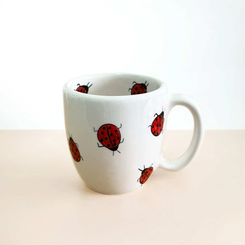 استمتع بتناول الشاي مع هذا الكوب المرسوم يدوياً والتي تتميز بطيور الدعسوقة المنتشرة في الجزء الخارجي والداخلي.