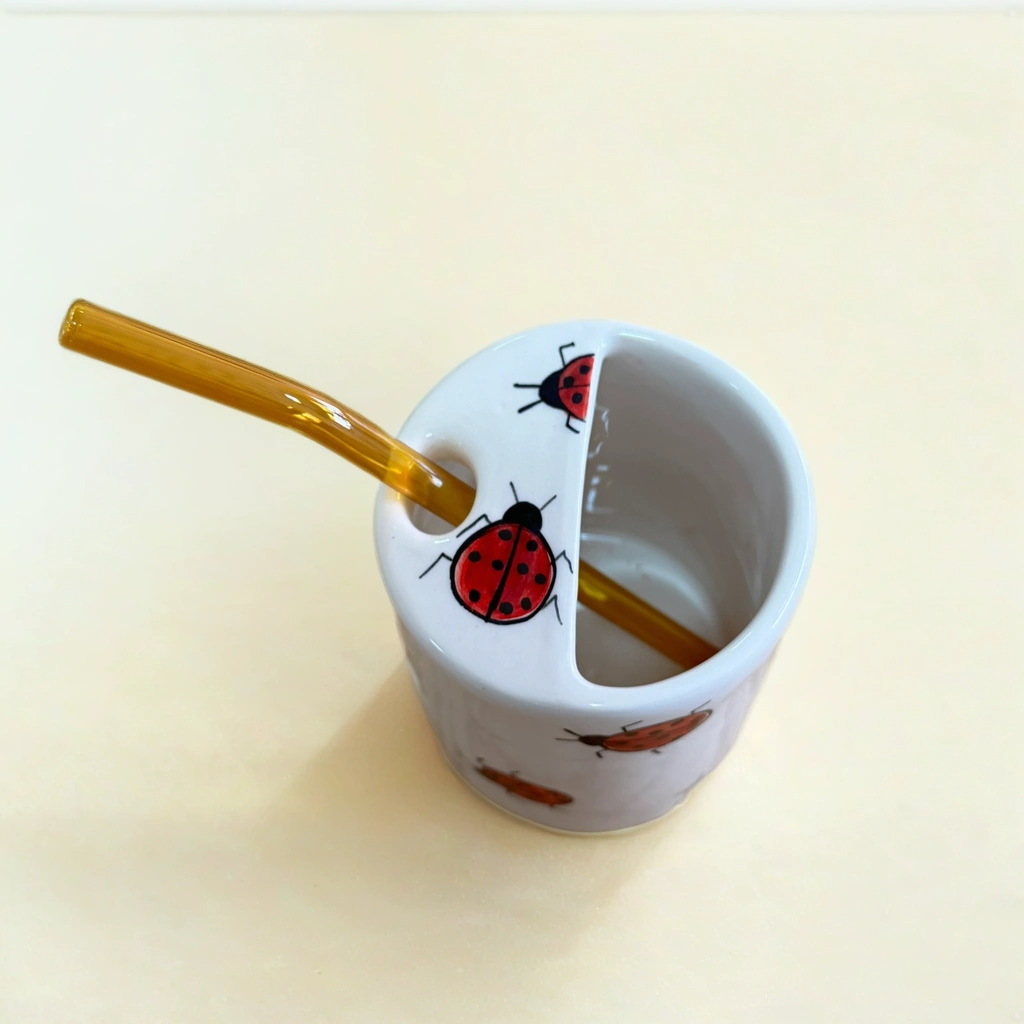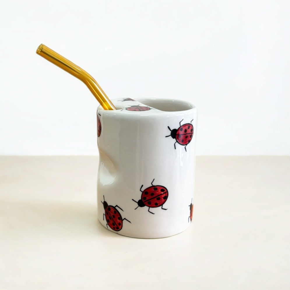 احتسي أثناء التنقل مع كوب السفر المصنوع من السيراميك بتصميم الدعسوقة. يأتي مع قشة زجاجية ذهبية اللون.