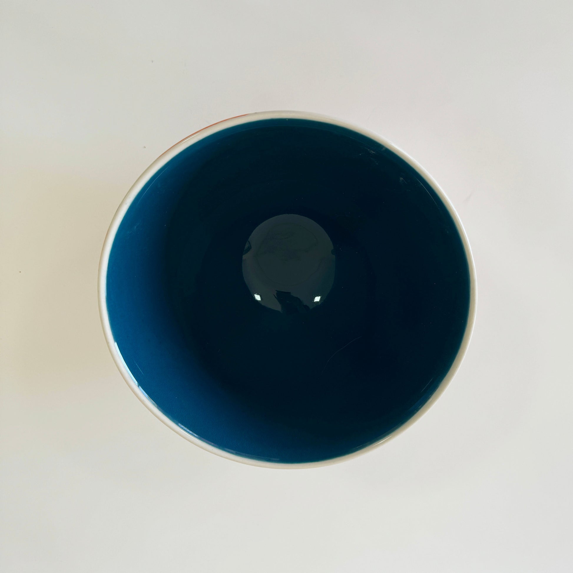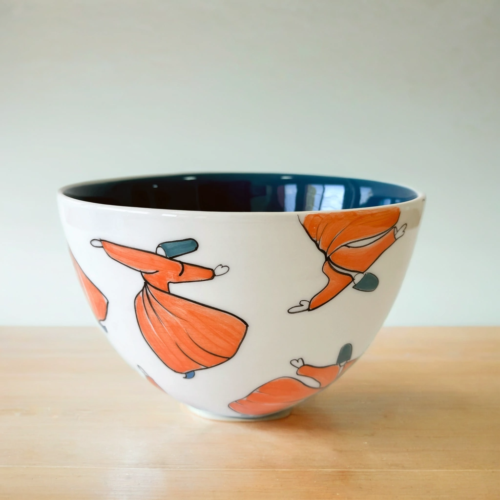 يجسد وعاء مخروط الدراويش باللون البرتقالي لمسة فنية، مزين بزخارف الدراويش البرتقالية الدوامة، مما يثير شعورًا بالحركة الأنيقة. تم تشطيب الجزء الداخلي بطلاء أزرق مخضر غني، مما يوفر تباينًا مذهلاً يضمن أن الوعاء جذاب بصريًا وعمليًا. إنه بمثابة وعاء مثالي لتقديم الطعام أو كلمسة زخرفية لمساحتك.