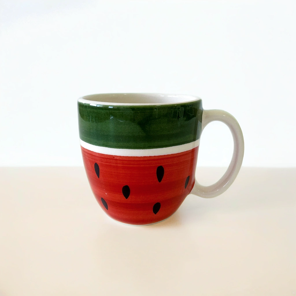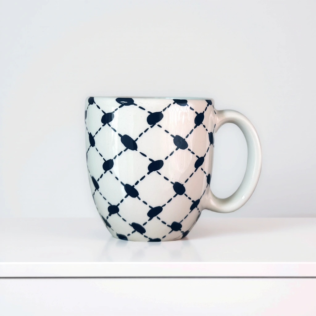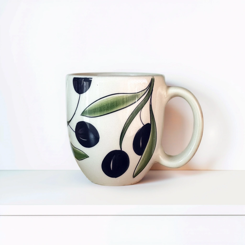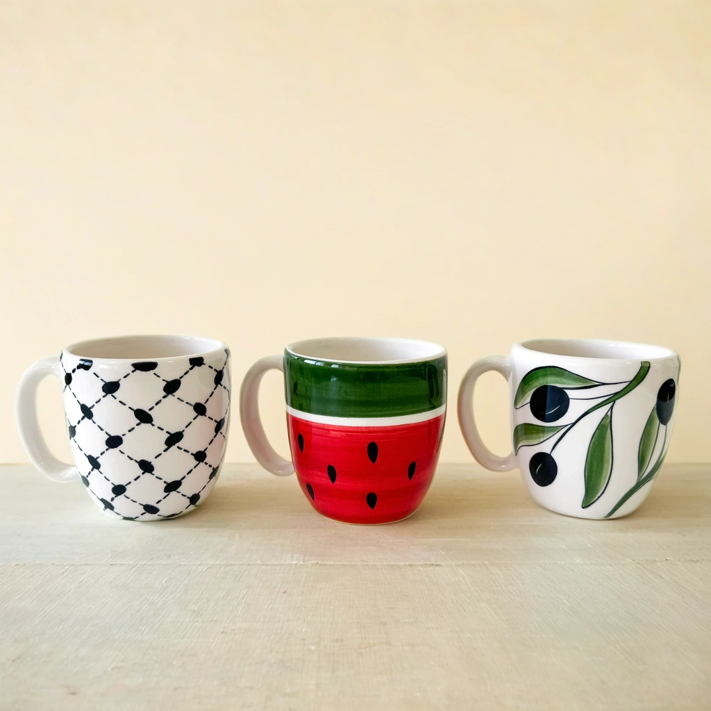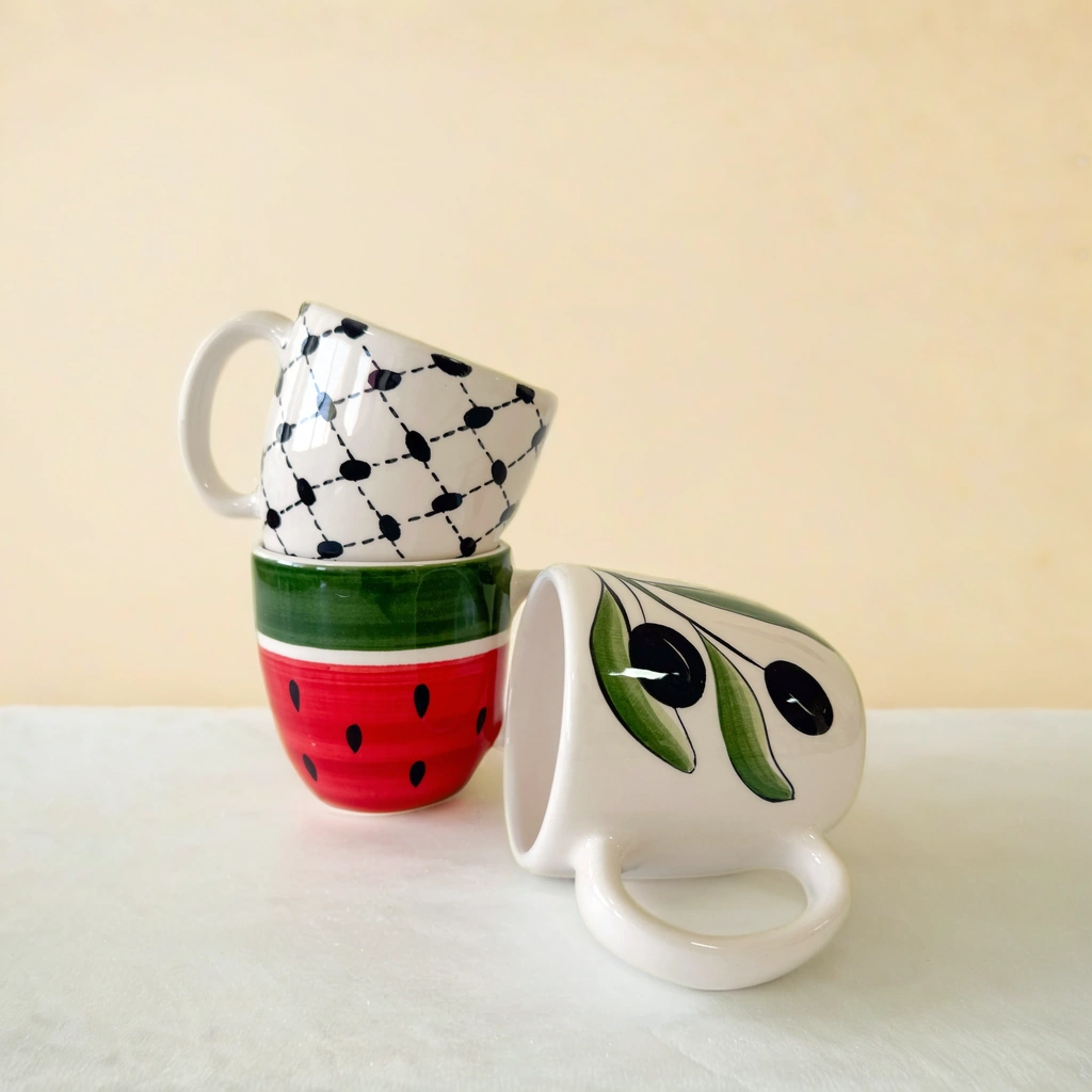أكواب خزفية مصنوعة يدويًا ومزينة بتصاميم فلسطينية مميزة. هذه الأكواب التراثية مثالية لإضفاء شعور بالتراث على روتينك اليومي.