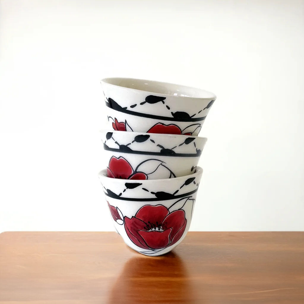 فناجين قهوة سادة بحواف مزخرفة بالكوفية وزهور خشخاش مرسومة يدويًا، كل فنجان يحتفي بالنسيج الثقافي الغني للتراث الأردني والفلسطيني.