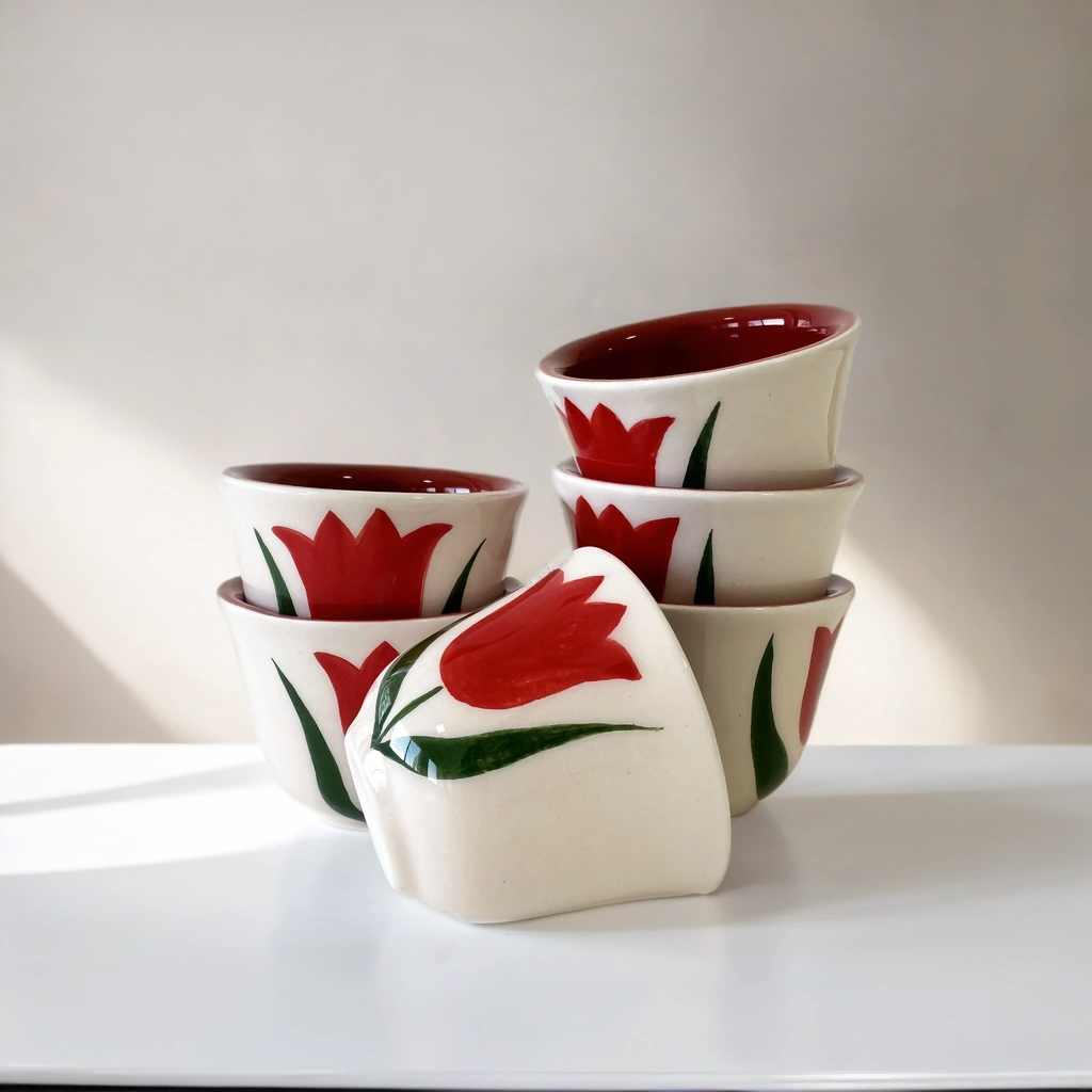 استكشف طقمنا المكون من 6 فناجين قهوة زهرة التوليب، المصمم بخطوط توليب أنيقة وداخلية مطلية باللون الأحمر. هذه الأكواب مثالية لتقديم القهوة العربية، ومناسبة للمناسبات الاجتماعية والاستمتاع اليومي.